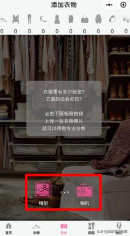 4、可以从相册选择衣物照片,也可以点击相机拍照,小程序会为搭配做出分析。